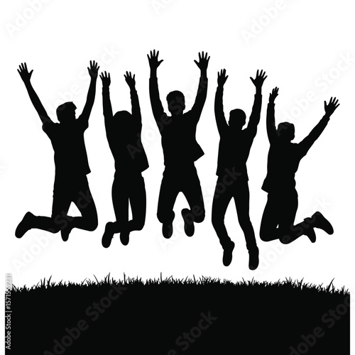 Silhouette vector of happy group of youth jumping in the air isolated on black and white background with energetic movement