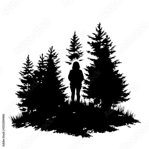 Silhouette Woman in Pine Forest Vector Illustration for Art and Decoration