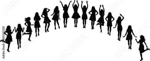 woman, silhouette, vector, group, pose, dress, arc, black, white, fun, jump, joy, style, fashion, graphic, white background, black-and-white
