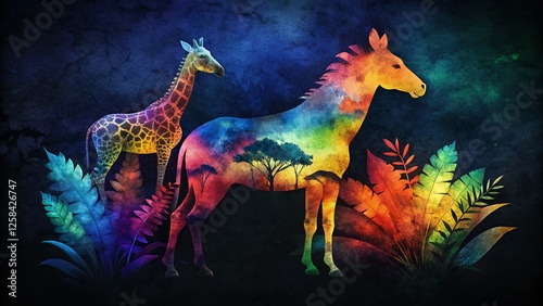 silhouette, watercolor, herb, texture, zoo, animal, illustration, delicate, elegant, artistic, dark background, high contrast, fine art