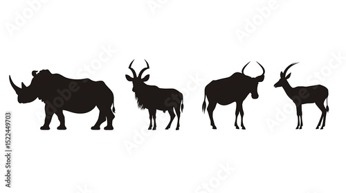 Silhouetted african wildlife featuring a rhino, hartebeest, wildebeest, and gazelle isolated on white background