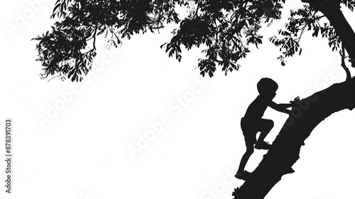 Silhouetted Child Climbing Tree on Minimalist Background with Adventurous Spirit