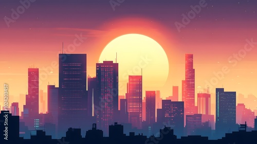 city, building, sunset, sky, cloud, sun, orange, red, pink, purple, city landscape, urban, silhouette, skyline, horizon, evening, night, twilight, architecture, modern, contemporary, window, glasses, steel, concrete, light, shadow, glow, vibrant, warm, calm, peaceful, dreamy, abstract, background, art, graphic, digital