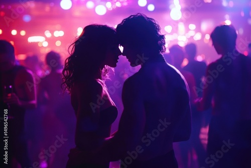 couple, silhouette, hugs, dancefloor, crowd, romantic, intimate, nightlife, party, people, blurred background, love, closeness, dark, atmosphere, youth, female, male, affection, togetherness, connection, night, social gathering, event, celebration, fun, energy, vibrant, music, clubbing, human relationships, tenderness, closeup, emotional, young adult, passion, interaction, dancing, fashion, casual attire, indoor