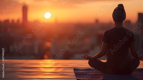 silhouette, person, yoga, meditation, rooftop, city landscape, skyline, sunset, dawn, dusk, outdoors, urban, landscape, tranquil, peaceful, serene, calm, contemplation, relaxation, wellness, lifestyle, exercise, activity, city, building, copy space, blurred background, mindfulness, harmony, solitude