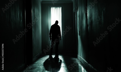 dark, hallway, silhouette, person, standing, window, light, creepy, scarey, ominous, mysterious, suspense, thriller, horror, shadow, gloom, fear, alone, isolated, weapon, knife, danger, threat, night, abandoned, eerie, haunted