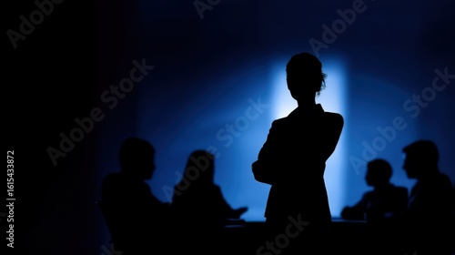 Silhouetted figures of businesspeople engaged in a meeting with one person standing confidently against a blue backlight.