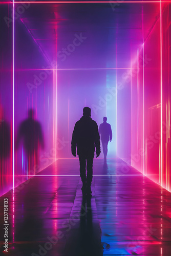 Silhouetted figures traversing a futuristic digital corridor with neon lights, symbolizing journey and discovery -