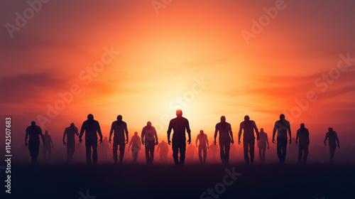 zombie, thriller, sunset, silhouette, adventure, horror, dusk, eerie, group, walking, landscape, dramatic, shadow, fog, mysterious, twilight, apocalyptic, fear, dark, people, scene, atmospheric, cinematic, tension, ominous, surreal, haunting, man, figure, horizon