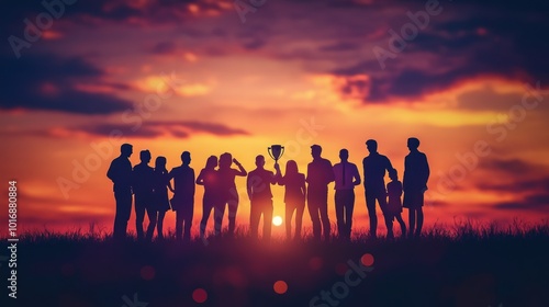 sunset, group, celebration, trophy, silhouette, sky, cloud, happiness, togetherness, nature, friends, joy, achievement, oneness, warmth, light, landscape, evening, moment, connection, people, scenery, horizon, teamwork, victory, fun, camaraderie, friendship, beauty, relaxation, event, gathering, pride, admiration, love, smile, diversity, excitement, calmness, summer, memory, success, sport, leisure, family