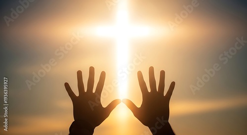 Silhouetted hands reaching towards a radiant cross against a vibrant sunset sky, capturing a serene moment of spiritual connection and divine light.