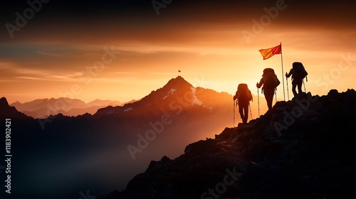 Silhouetted hikers ascending a rugged mountain trail with a vibrant flag fluttering atop a distant summit captivating landscape cinematic lighting romantic era serene wilderness