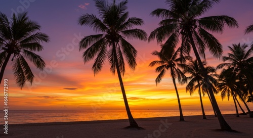 Silhouetted Palm Trees at Tropical Sunset Beach