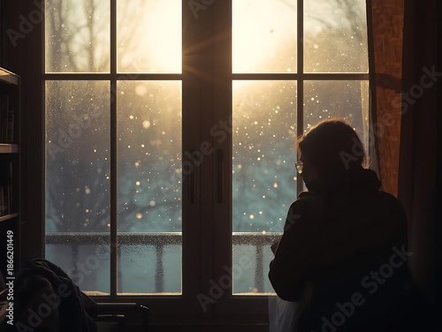 silhouette, person, window, snow, sunset, winter, cold, cosy, peaceful, calm, serene, contemplative, introspective, quiet, stillness, snowflake, frosty, icy, chill, warmth, light, glow, gold, soft, gentle, hopeful, reflective, pensive, winter landscape, frost, emotional, introspection, solitude