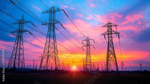 sunset, electricity, power, energy, transmission, line, tower, pylon, landscape, sky, pink, purple, orange, industrial, silhouette, evening, nature, technology, infrastructure, grid, electrical, tower, high, voltage, electric, colourful, beautiful, light, vibrant, colours, rural, scene, generation, area, plant, over, industry, wire, support, structure, network
