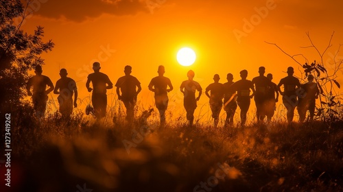 sunset, silhouette, runner, running, athlete, group, teamwork, endurance, fitness, exercise, sport, competition, marathon, race, healthy, lifestyle, active, nature, landscape, golden hour, sun, bright, warm, colours, energy, power, determination, motivation, strong, people, man, evening, horizon, grass, field, backlit