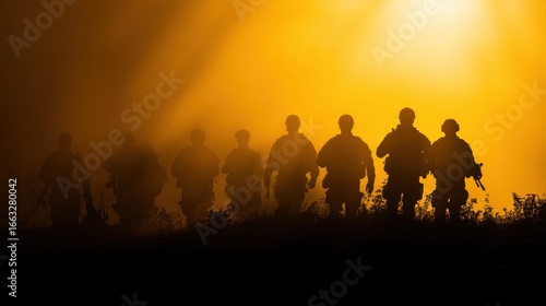 soldier, silhouette, marching, sunset, military, dusk, teamwork, oneness, shadow, orange, horizon, landscape, peace, mission, freedom, courage, strength, bravery, patrol, evening, glow, sun, light, camaraderie, warrior, defense, protection, security, duty, service, honour, commitment, resilience, operation, terrain, squad, discipline, alert, readiness, tactical