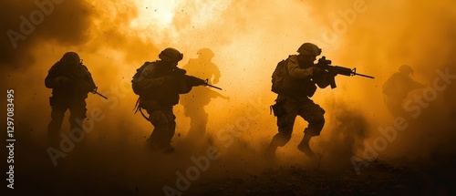 Silhouetted soldiers running through smoke and fire, armed and ready. Represents courage, sacrifice, and conflict. Ideal for defense, security, and emergency themes.