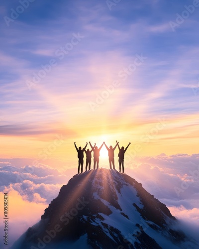 silhouette, snowy, mountain, sunrise, oneness, triumph, adventure, peak, sky, celebration, breathtaking, optimism, freedom, inspiration, peace, captivating, scenic, serene, journey, majestic, exploration, invigorating, exhilarating, dawn, picturesque, team, ascent, vista, harmony, cloudscape, dramatic, wanderlust, climbing, landscape, nature, radiant, peaceful, bliss, positivity