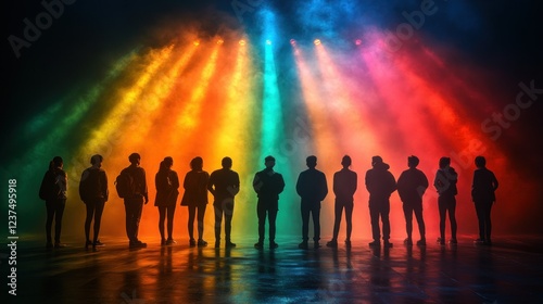 silhouette, rainbow, light, stage, performance, group, people, colourful, show, night, dark, fog, smoke, beam, spotlight, shadow, dramatic, mystery, art, artistic, visual, image, photo, composition, backlit, contrast, high-coloured, bright, intense, spectrum, hue, shade, tone, texture, setting, scene, atmosphere, event