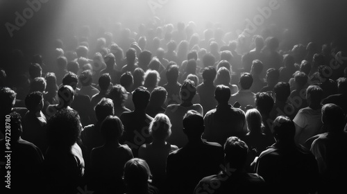 crowd, people, audience, silhouette, black, white, dark, room, theatre, concert, show, stage, event, performance, gathering, spectator, massa, assembly, group, together, oneness, expectation, waiting, attentive, focused, anonymous, face, head, sitting, chair, darkness, light, spotlight, shadow, monochrome, greyscale, photo, photo, art, visual, composition, perspective, top, view, angle