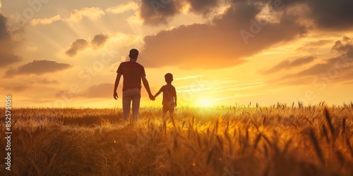 Silhouettes of a father and son holding hands, walking through a field during a breathtaking sunset