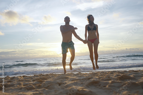 silhouettes of athletes running along the beach / sports summer in the warm sea, healthy rest, sports activity, summer vacation