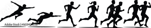Silhouettes of athletes running, sprinting, and jumping in motion sequence, showcasing speed, agility, fitness, dynamic movement, sports illustration, action.