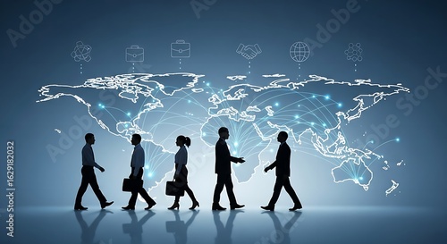 silhouette, business, people, walking, world map, connection, icon, global, network, international, corporate, team, strategy, leadership, success, partnership, agreements, briefcase, globe, molecular, communication, technology, future, innovation, growth, expansion, market, opportunity, collaboration, worldwide, connectivity, digital, modern, professional, development, career, achievement, progress, direction, vision