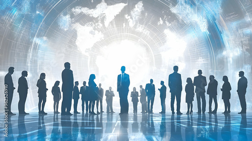 Silhouettes of Business Professionals Standing Together in Front of a World Map Background with Digital Elements