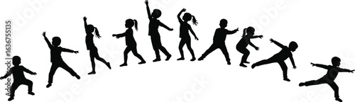 Silhouettes of children jumping and playing, energetic kids in motion, joyful youth, dynamic poses, fun activity, outdoor happiness, stock image