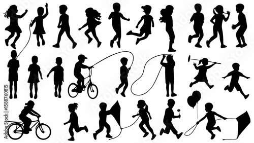 silhouette, children, playing, game, activity, jumping, running, rope, kite, bicycle, balloon, children, children, boy, girl, happy, fun, active, youth, childhood, playtime, recreation, exercise, energetic, joyful, silhouette