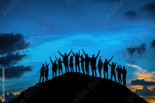 silhouette, group, people, man, woman, standing, celebration, victory, sunset, triumphant, oneness, togetherness, joy, achievement, horizon, dusk, teamwork, success, support, accomplishment, sky, shadow, gathering, pride, harmony, jubilant, festive, collective, motivation, inspiration, silhouette, crowd, team