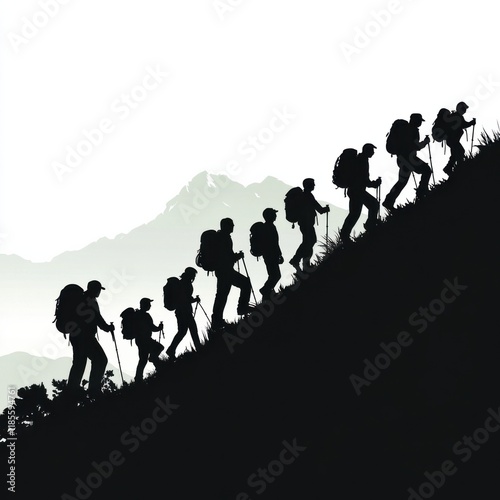 Silhouettes of hikers climbing a mountain trail.