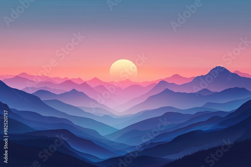 Silhouettes of mountains against sunset sky in a realistic mountain landscape illustration