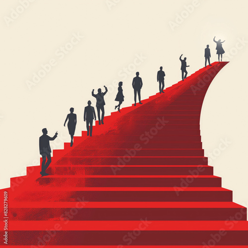 Silhouettes of People Climbing Red Staircase Towards Bright Light Symbolizing Success and Achievement..