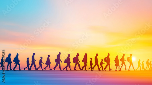 silhouette, people, walking, crowd, sunset, vibrant, colours, movement, connection, horizon, evening, diverse, shadow, landscape, travel, journey, lifestyle, urban, nature, scenery, group, family, friends, together, activity, freedom, exploration, joy, harmony, light, dusk, figure, scene, background, warm, colourful, sky, twilight, community, pedestrian, street, motion, human