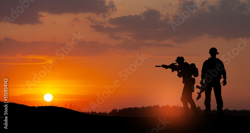 Silhouettes of soldiers standing against the backdrop of a sunset. Greeting card for Veterans Day, Memorial Day, Independence Day. USA celebration. Concept - patriotism, protection, remember honor.