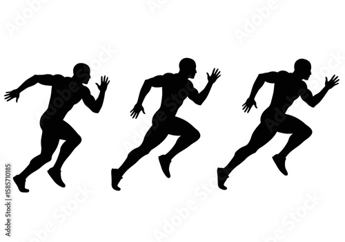 Silhouettes of three male athletes in full stride, showcasing speed and athletic movement against a clean white background.