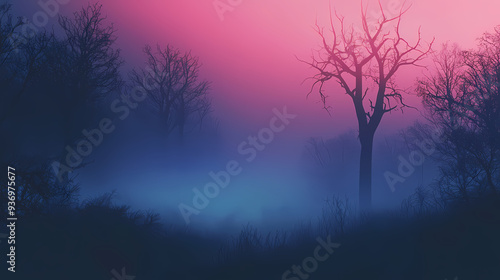 fog, tree, forest, silhouette, twilight, sky, pink, blue, mist, nature, dark, mood, landscape, branch, bare, evening, atmosphere, hazy, dreamy, art, digital, painting, illustration, graphic, design, abstract, background, minimal, aesthetic, gloomy, eerie, skittish, mystic, magical, fantasy, surreal