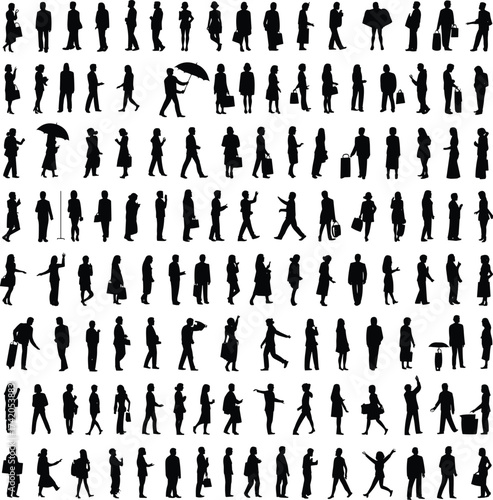 Silhouettes of walking people, business professionals, urban pedestrians, crowd movement, city life, standing, walking, casual and formal clothing, commuting.