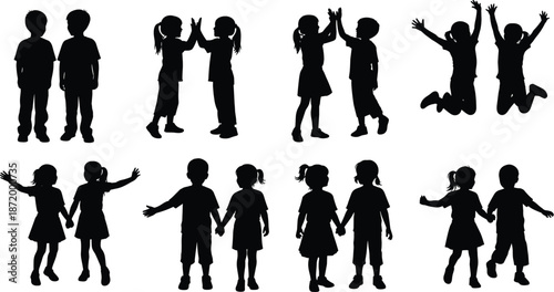 Silhouettes of young children interacting, high-fiving, jumping, holding hands and playing together representing friendship, teamwork and joyful childhood connection