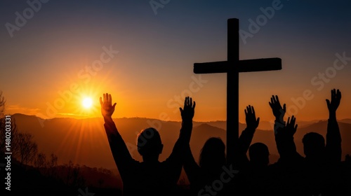 worship, sunrise, cross, silhouette, faith, oneness, jesus christ, prayer, spirituality, gathering, spiritual, hope, togetherness, contemplation, harmony, meditation, belief, peace, holy, devotion, inspiration, community, religion, dawn, horizon, hand, gratitude, blessing, praise, congregation, fellowship, mountain, love, scenic, christianity, morning, light, sun, outdoors, sky, celebration, beauty, nature