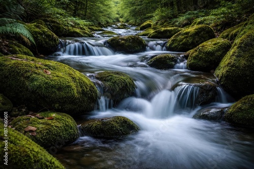 Silky smooth stream running over rough moss-covered rocks in a quiet nature scene