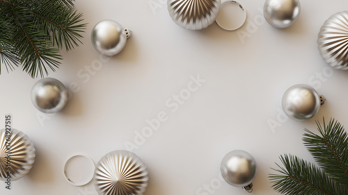 Silver Christmas ornaments and pine branches arranged on a white surface