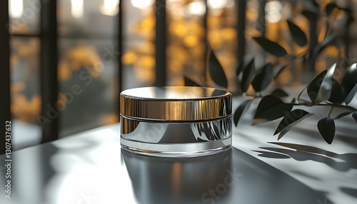 Silver Cosmetic Cream Jar on White Table with Green Leaves