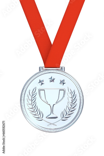 Silver medal with trophy, laurels and stars. Victory, best product, service or employee, second place concept. Png clipart isolated on transparent background