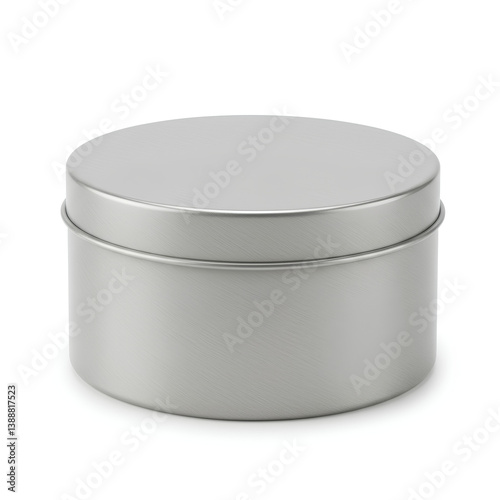 Silver Round Tin with White Lid. Close-up shot of a metallic, circular container with a solid white cover. Ideal for showcasing packaging or storage