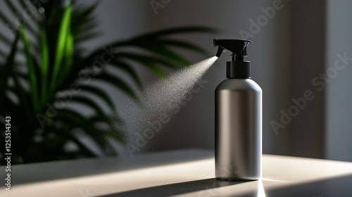 spray, bottle, mist, silver, aluminium, container, pump, sprayed, liquid, clean, disinfectant, product, cosmetic, beauty, home, care, plant, green, leaf, sunlight, light, shadow, table, surface, background, minimal, modern, simple, aesthetic, photo, still, life, object, design, texture, metal, glossy, shiny, interior, room