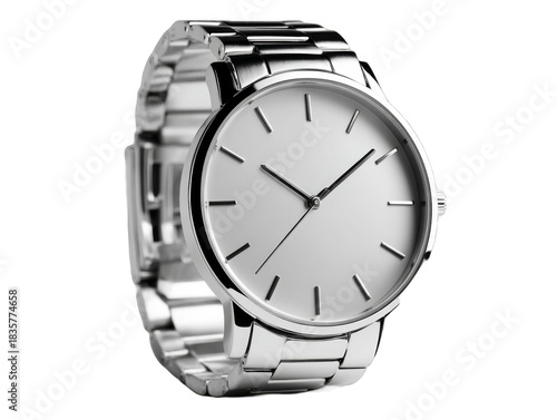 Silver watch with a simple dial and metal band on a transparent background, showing time-telling mechanism